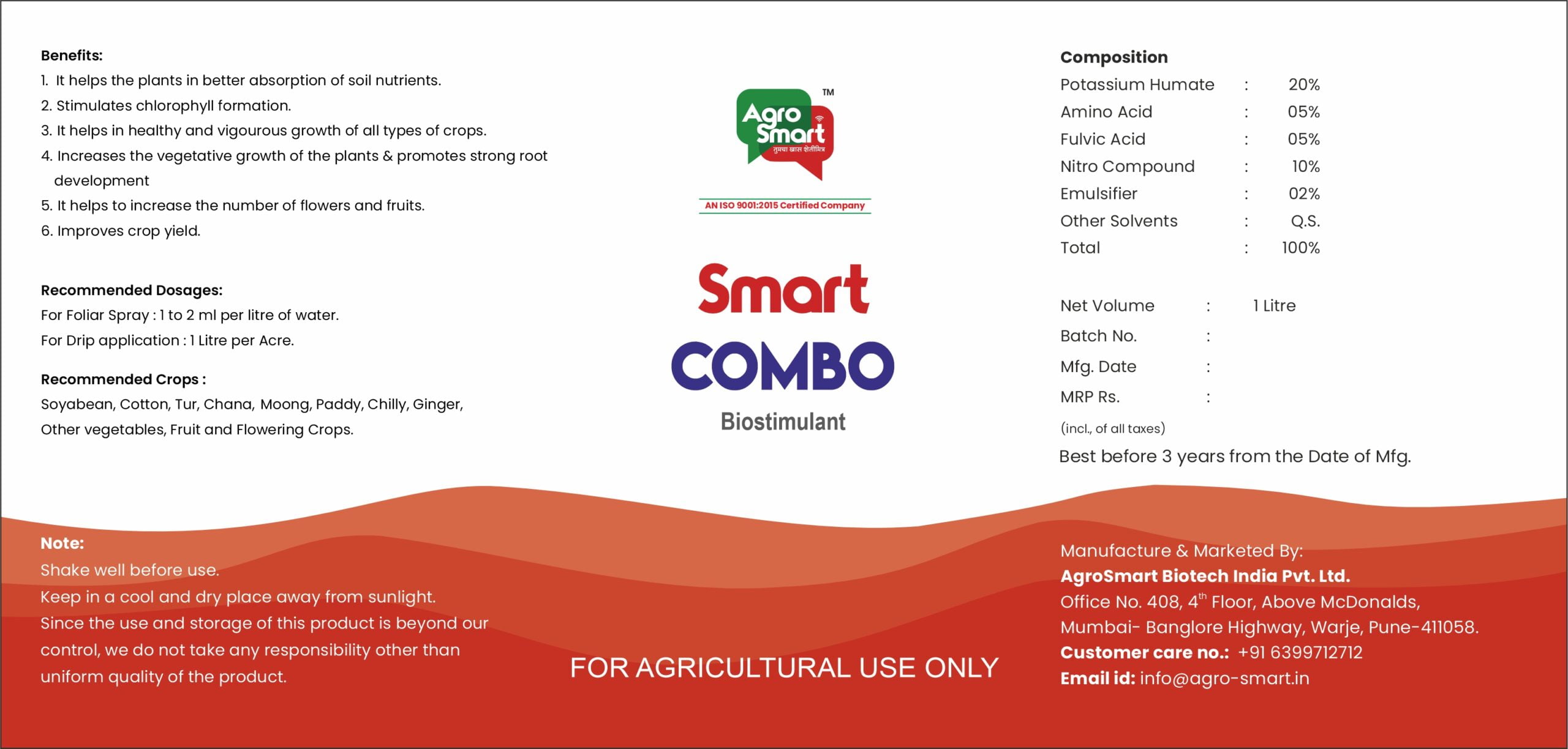 For Foliar Spray 1 to 2 ml per litre of water For Drip application 1 Litre per Acre.